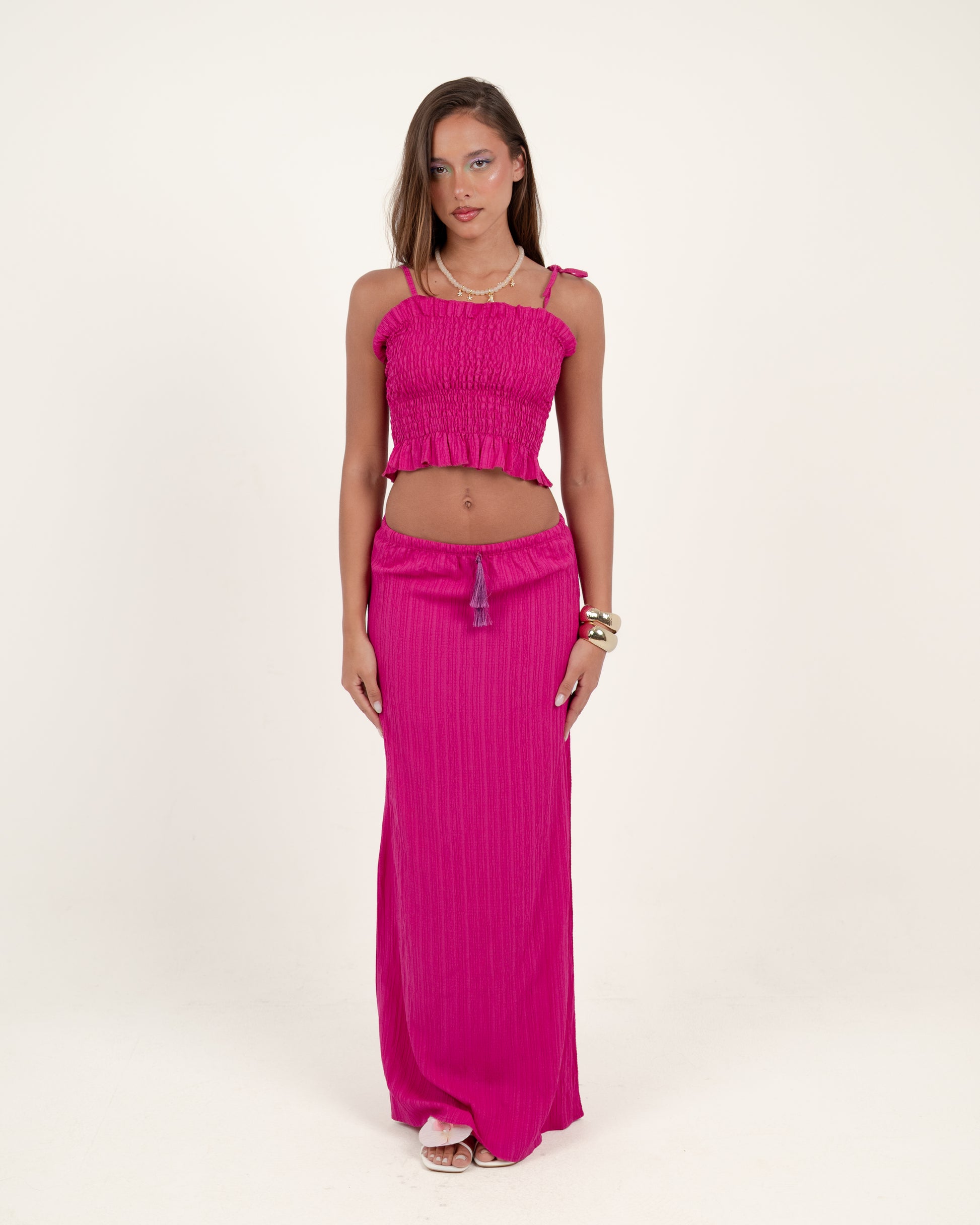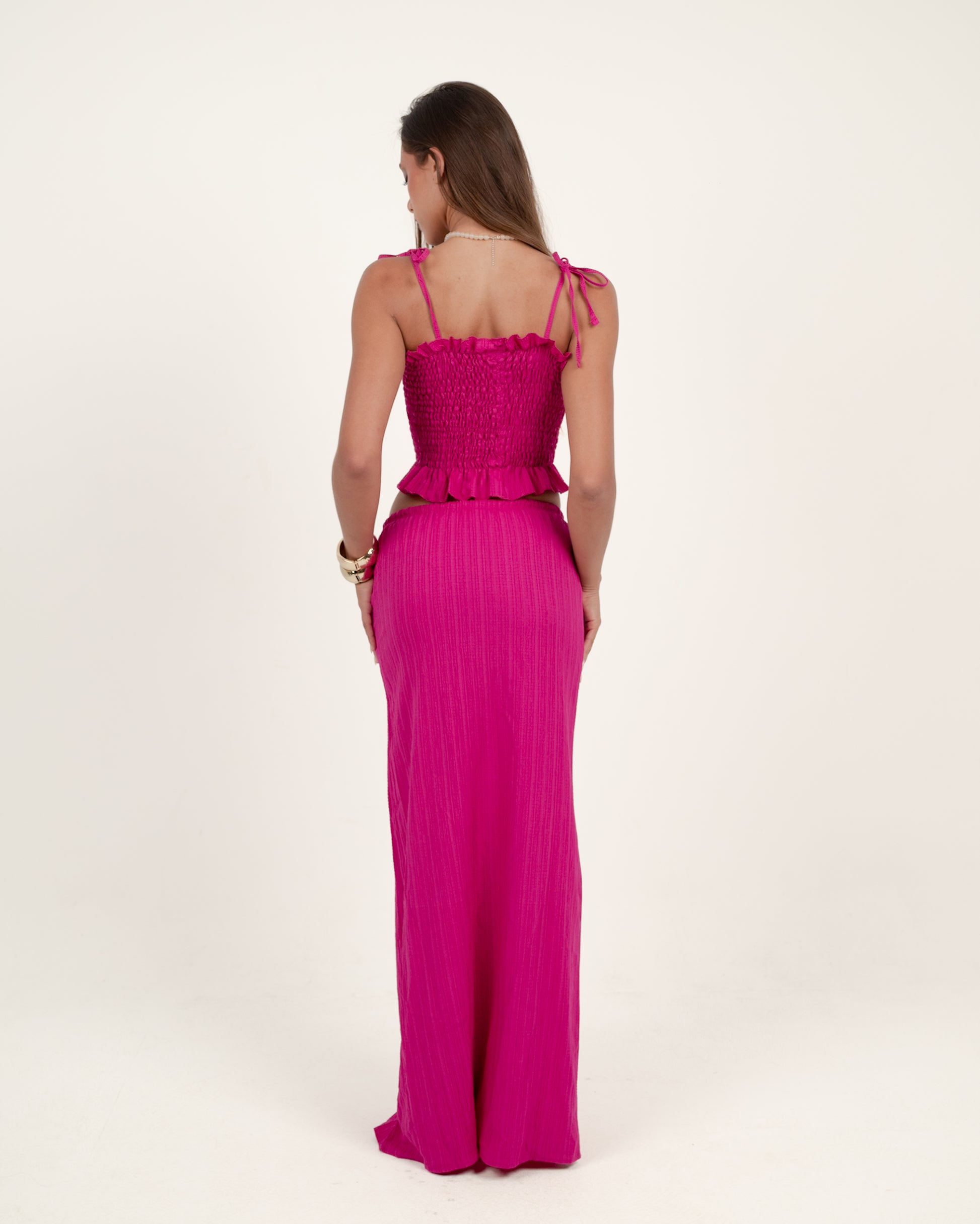 Embrace sunny-day style with this breezy linen set in radiant pink or soft lavender. The smocked cropped top with ruffle trim pairs perfectly with the flowing ankle-length skirt for an effortlessly chic look. Crafted from breathable linen with a soft elastic waistband for all-day comfort.