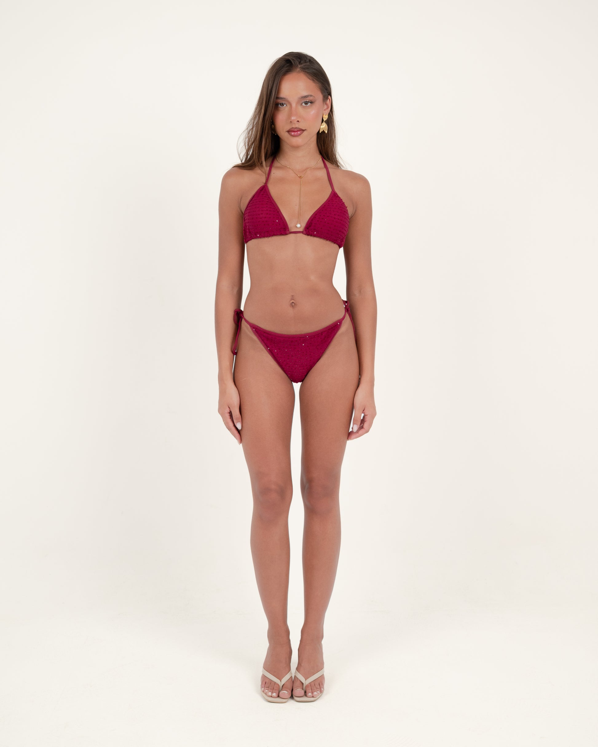 Make an entrance in the Granada Bikini, a dazzling two-piece set. The triangle top and tie side bottoms shimmer in the sun, catching the light with every move. Effortlessly bold, endlessly flattering.