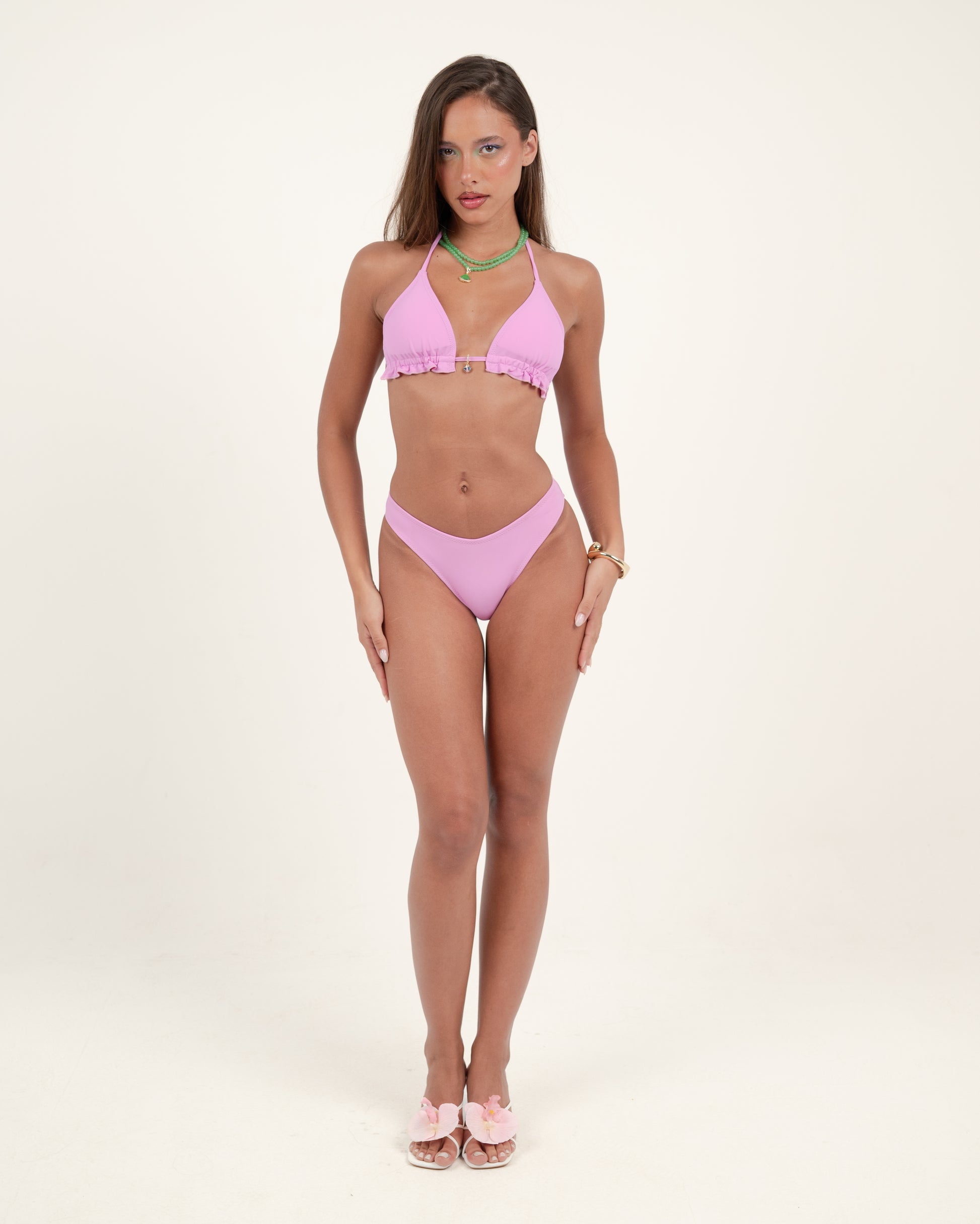 The top features the iconic triangle top for ultimate support. The classic bikini bottom features a fully lined construction for all day comfort. Comes with removable cups and a pouch.